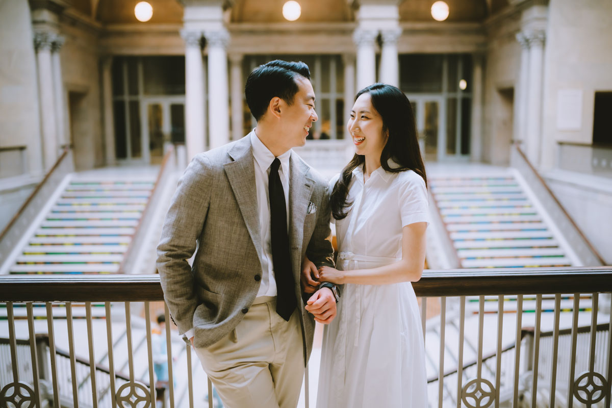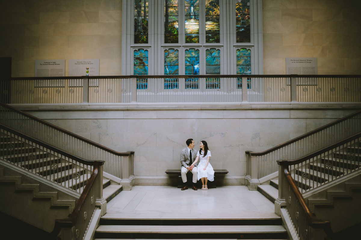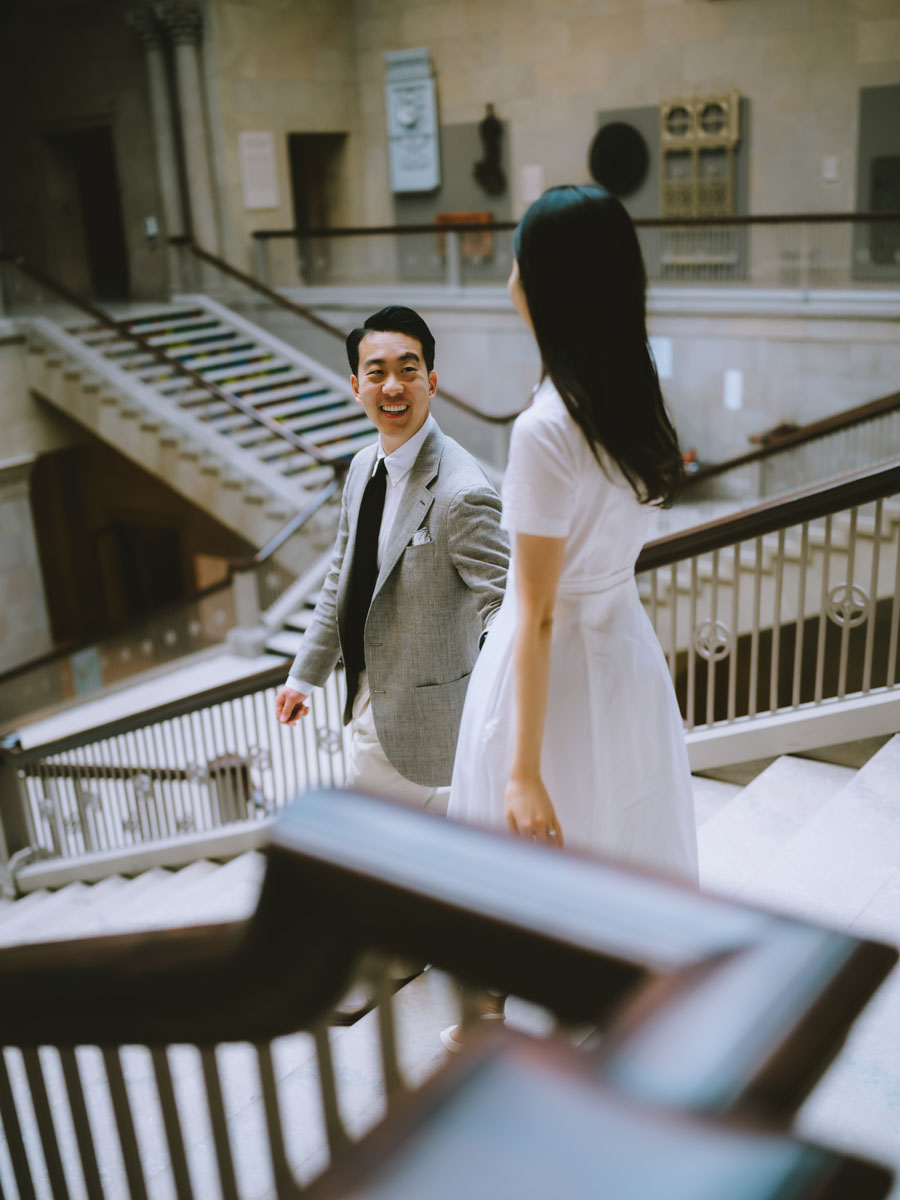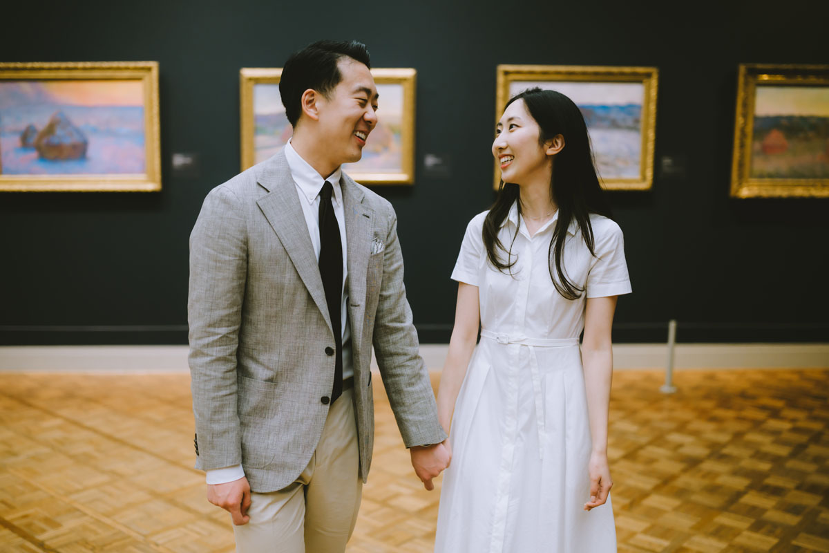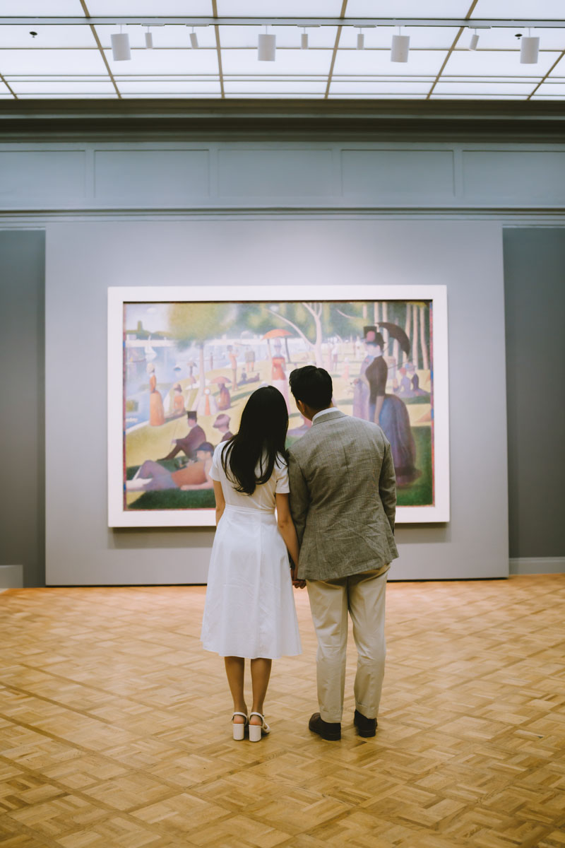 Kaitlyn and Andrew wanted their Art Institute of Chicago engagement shoot to feel like their romantic dates. They have been racking up the frequent flyer miles to see each other every chance they get. Because he lives in Boston and she is currently in Chicago, they love to plan romantic dates together when they are in the same city. Visiting museums is one of the things they enjoy together.