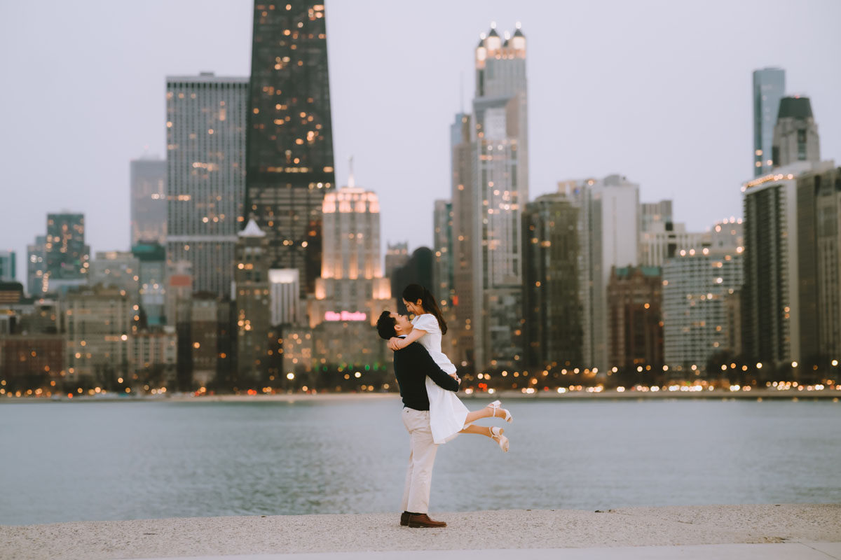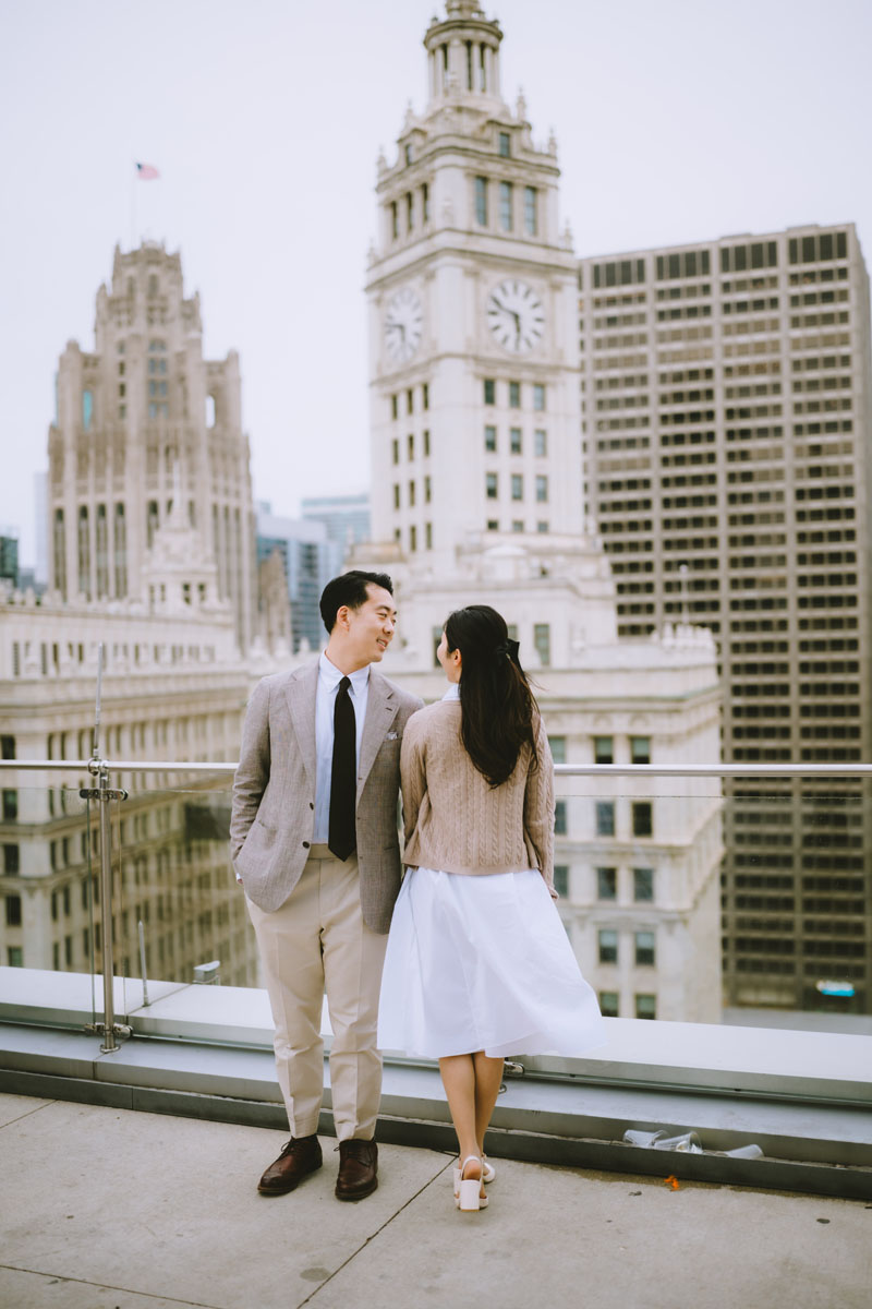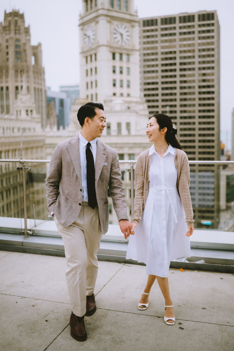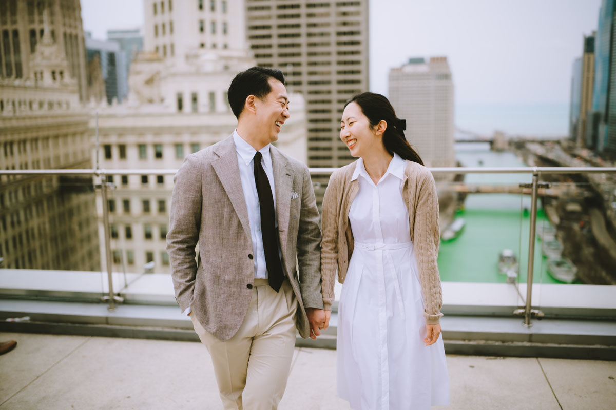 Taking a stroll around the city, they also wanted some engagement photos at Chicago’s most iconic spots, like the Wrigley Building. However, their engagement shoot happen to fall on the day of the Chicago Irish parade, where they dye the river green. Needless to say, there was a big crowd all around the riverwalk. We improvised and headed up to the rooftop area of the Trump Hotel and got some gorgeous photos up high. We finished up the day at North Avenue beach.