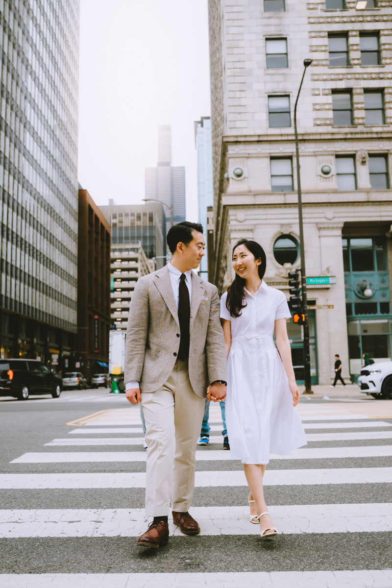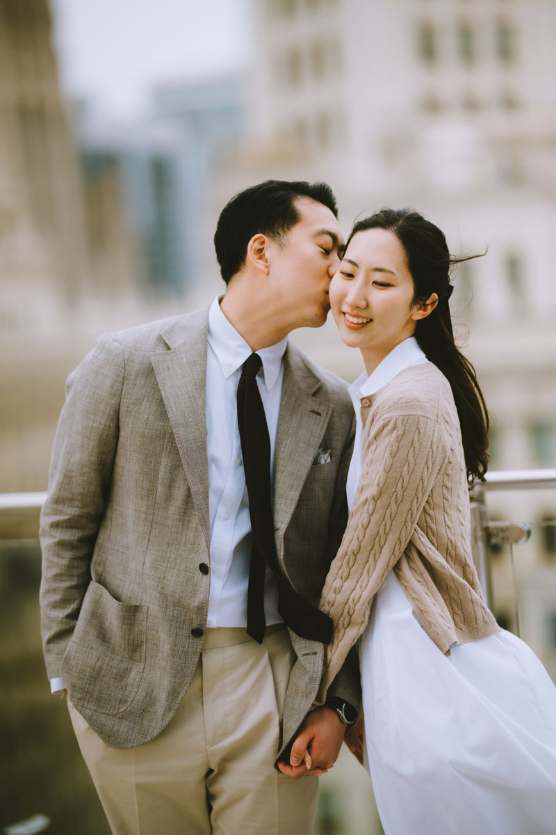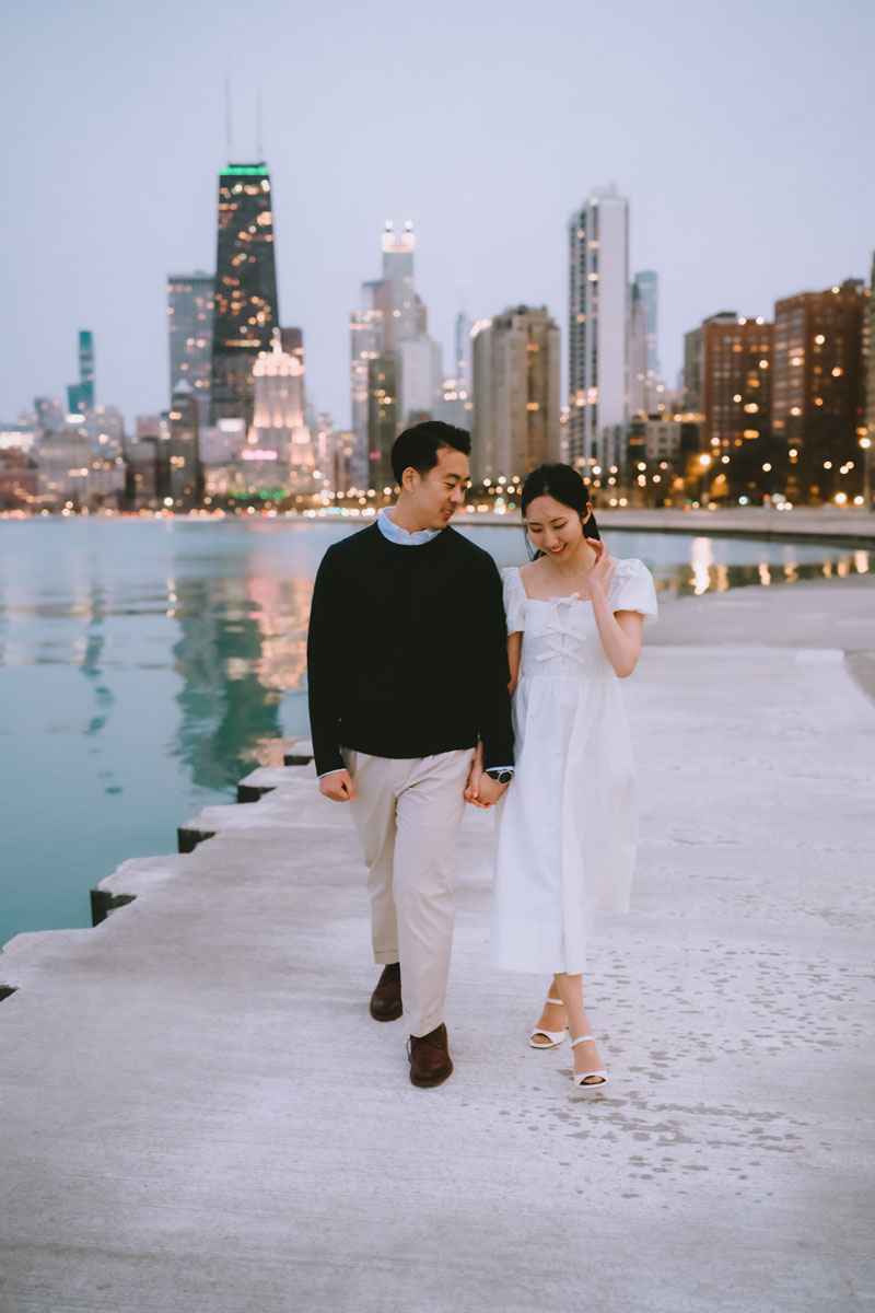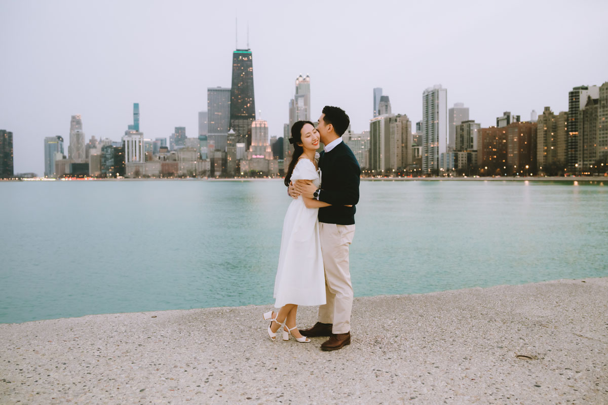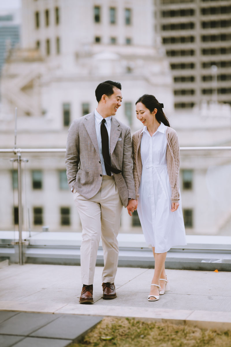 Taking a stroll around the city, they also wanted some engagement photos at Chicago’s most iconic spots, like the Wrigley Building. However, their engagement shoot happen to fall on the day of the Chicago Irish parade, where they dye the river green. Needless to say, there was a big crowd all around the riverwalk. We improvised and headed up to the rooftop area of the Trump Hotel and got some gorgeous photos up high. We finished up the day at North Avenue beach.