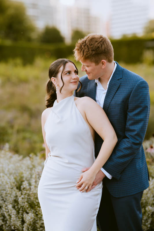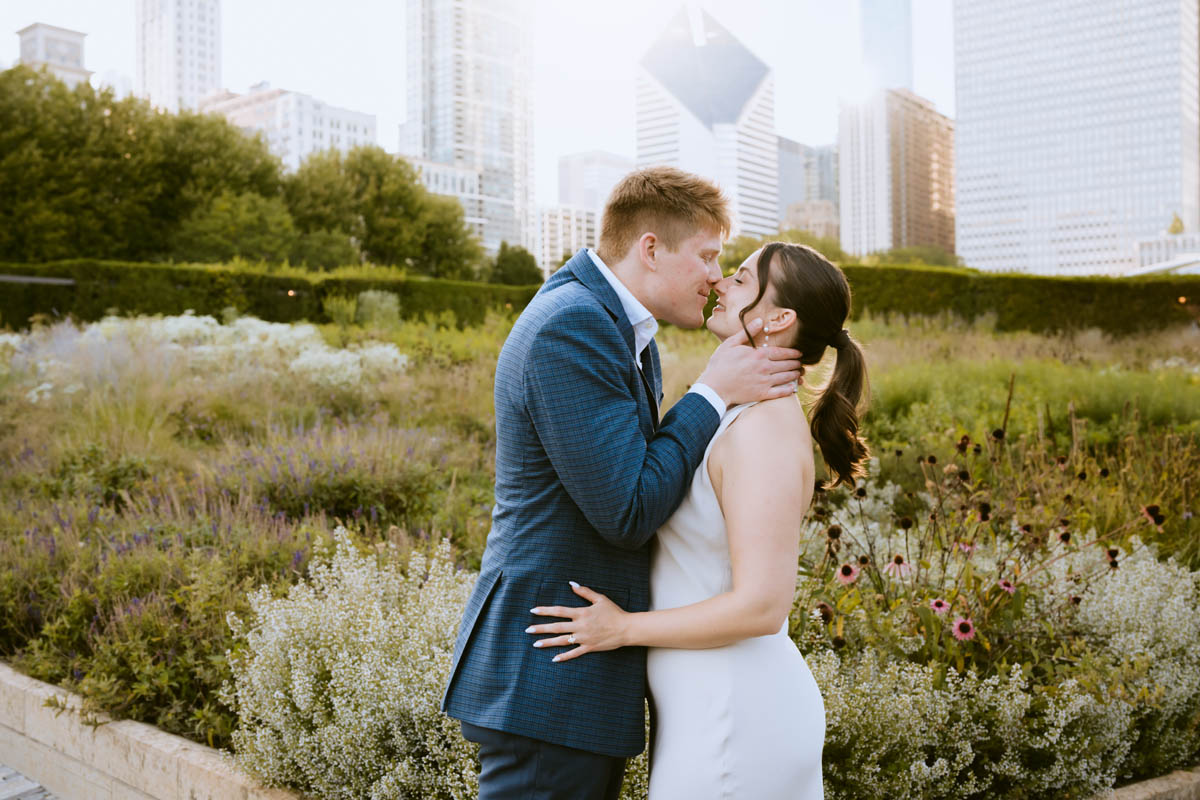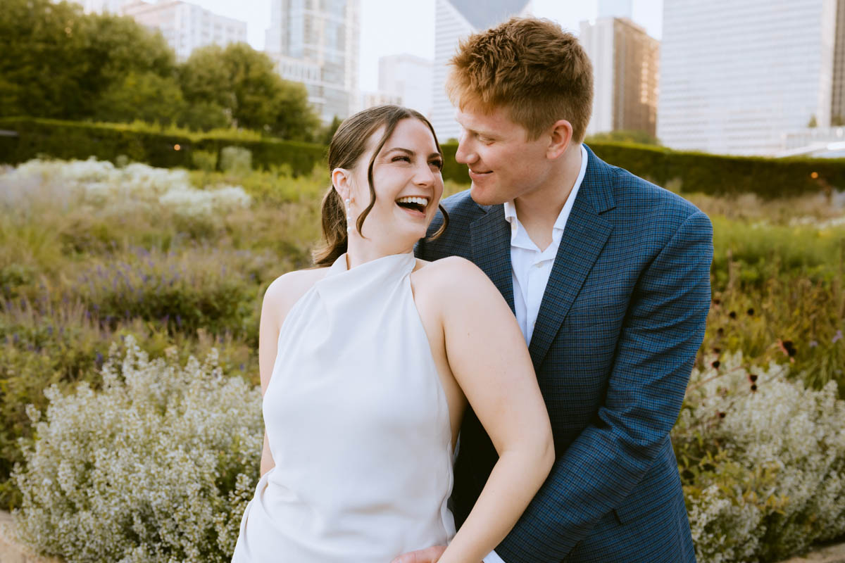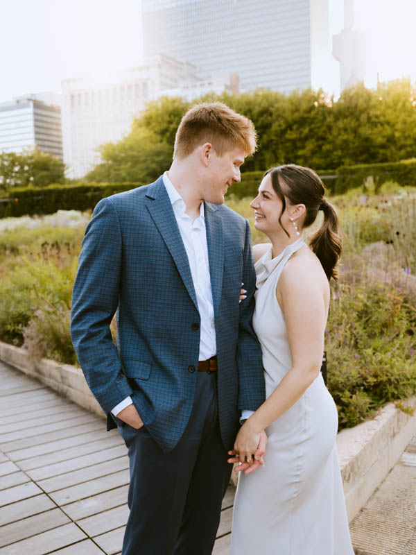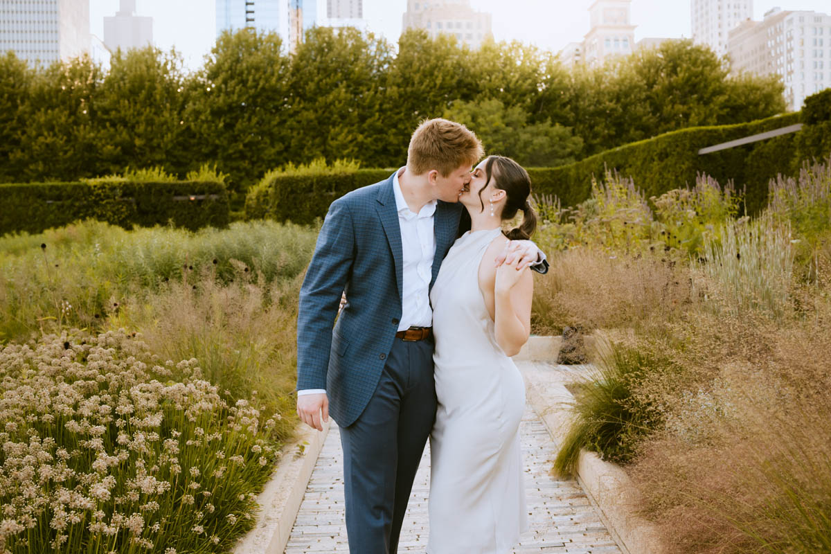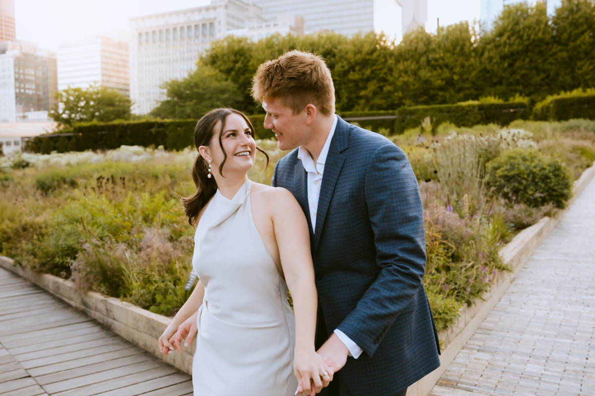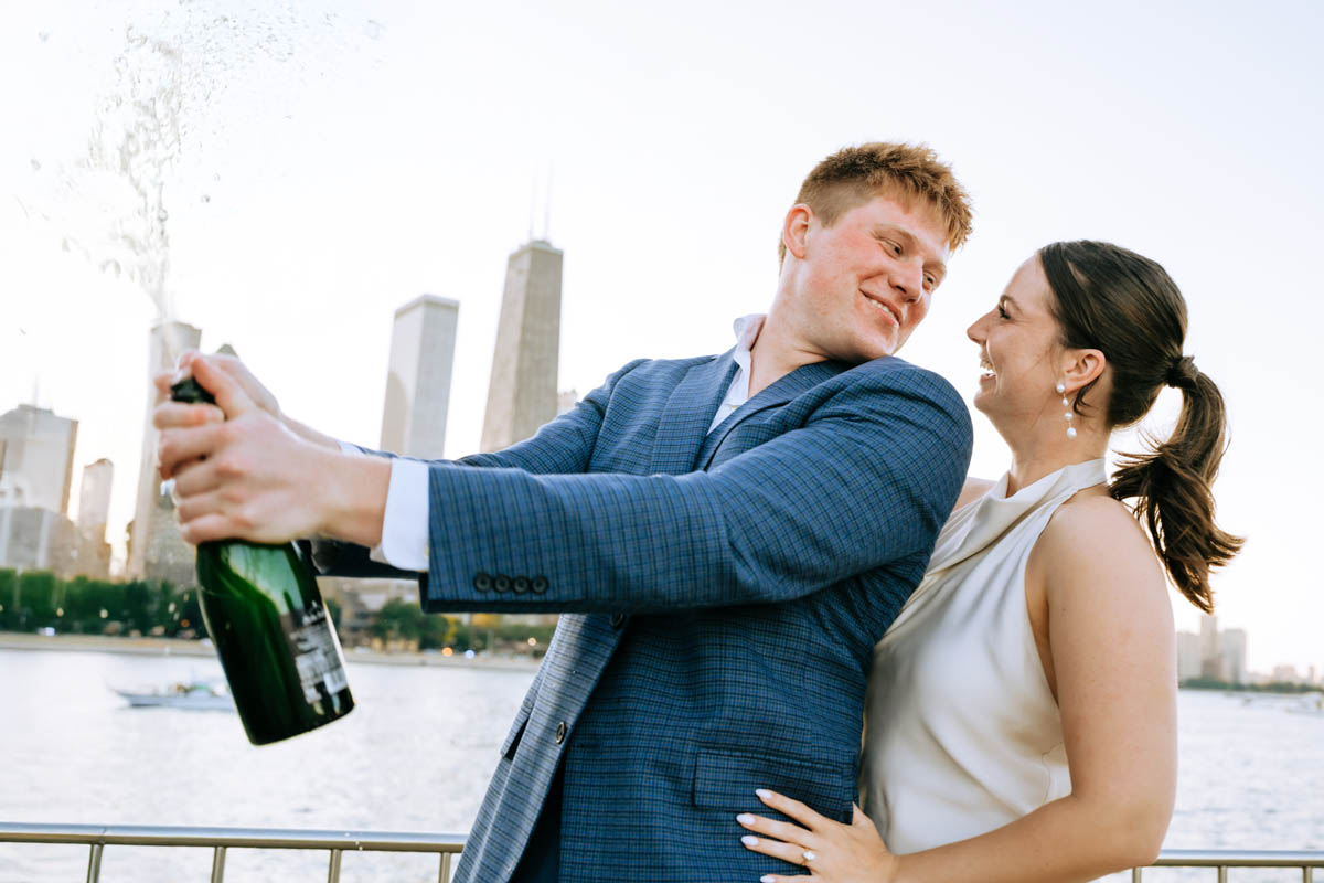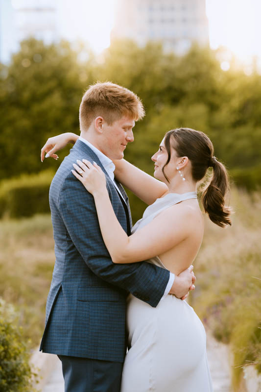 With a rare night off together to enjoy a date night, Grace and Joe had fun laughing and dance together. Stopping at the most iconic spots around the city, they had so much fun together. With the sun gleaming across the L tracks and through the buildings, we started shooting around the Chicago Board of Trade. For a change of scenery, we headed to the beautiful greenery at the Lurie Garden. Then it was off to Olive Park to catch the setting sun while popping the champagne!