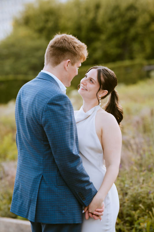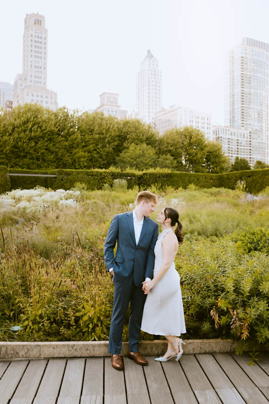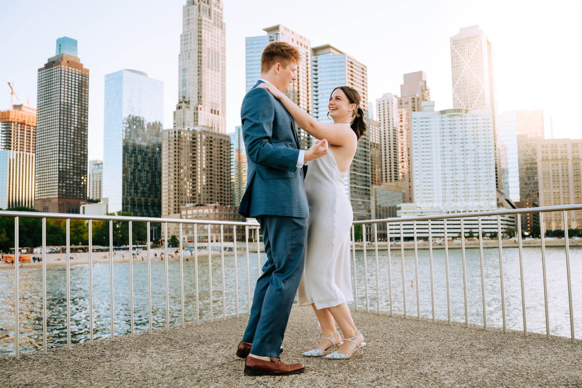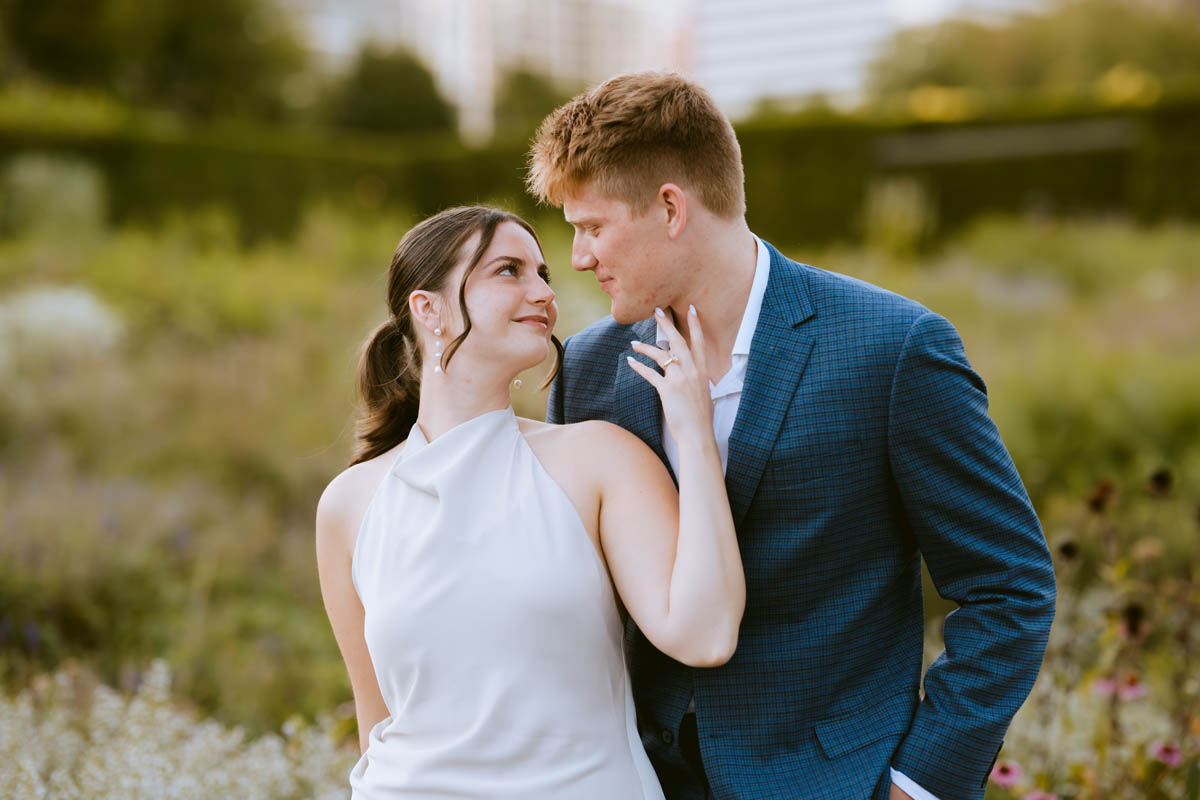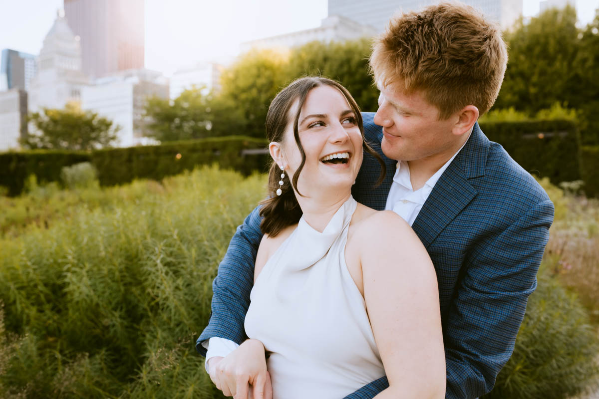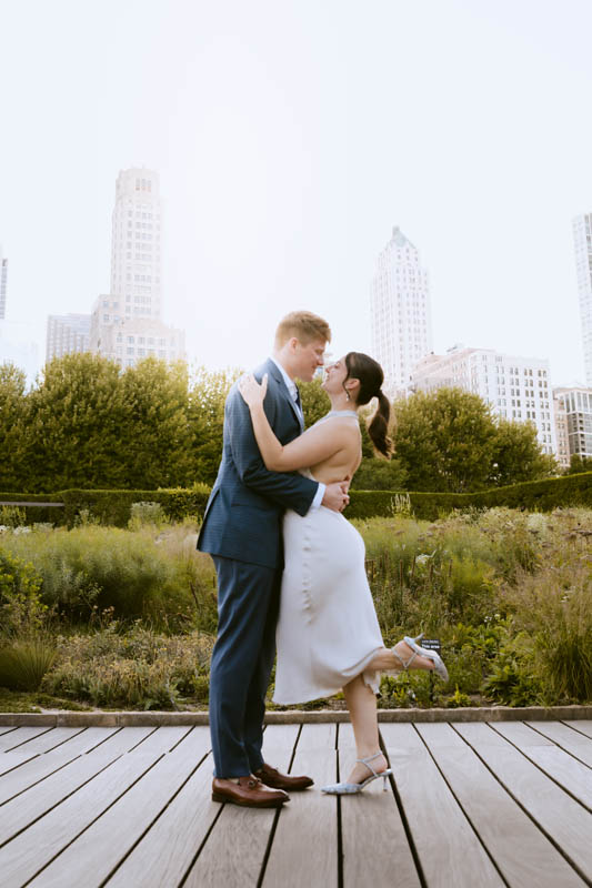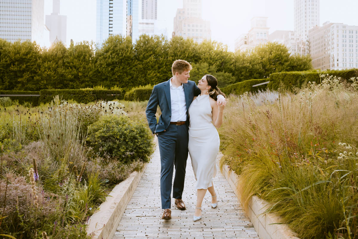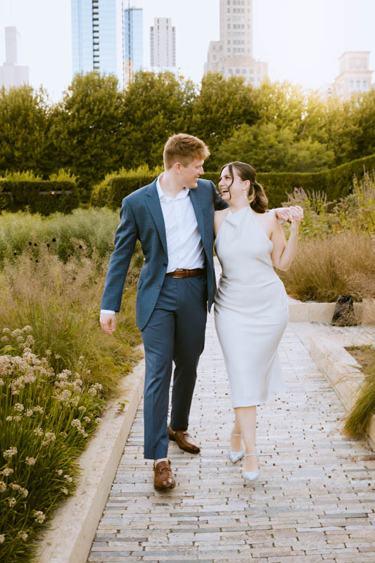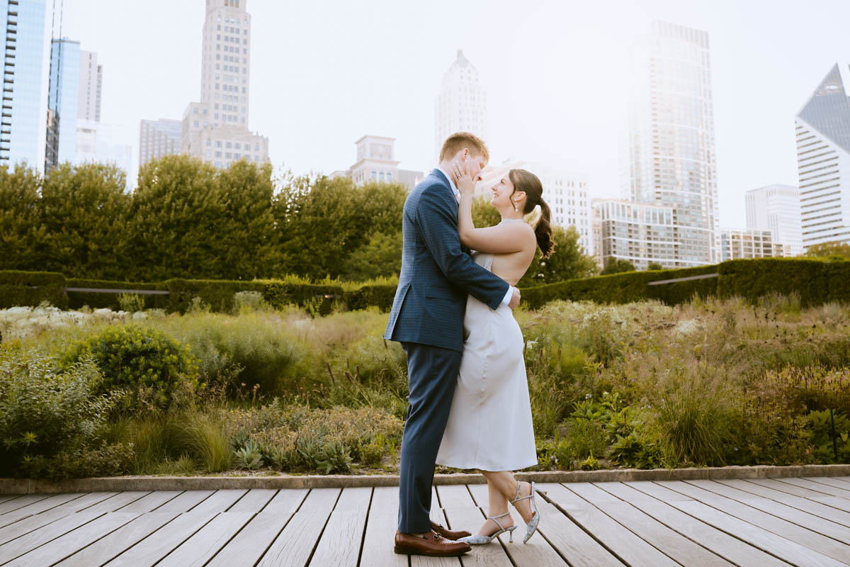 With a rare night off together to enjoy a date night, Grace and Joe had fun laughing and dance together. Stopping at the most iconic spots around the city, they had so much fun together. With the sun gleaming across the L tracks and through the buildings, we started shooting around the Chicago Board of Trade. For a change of scenery, we headed to the beautiful greenery at the Lurie Garden. Then it was off to Olive Park to catch the setting sun while popping the champagne!
