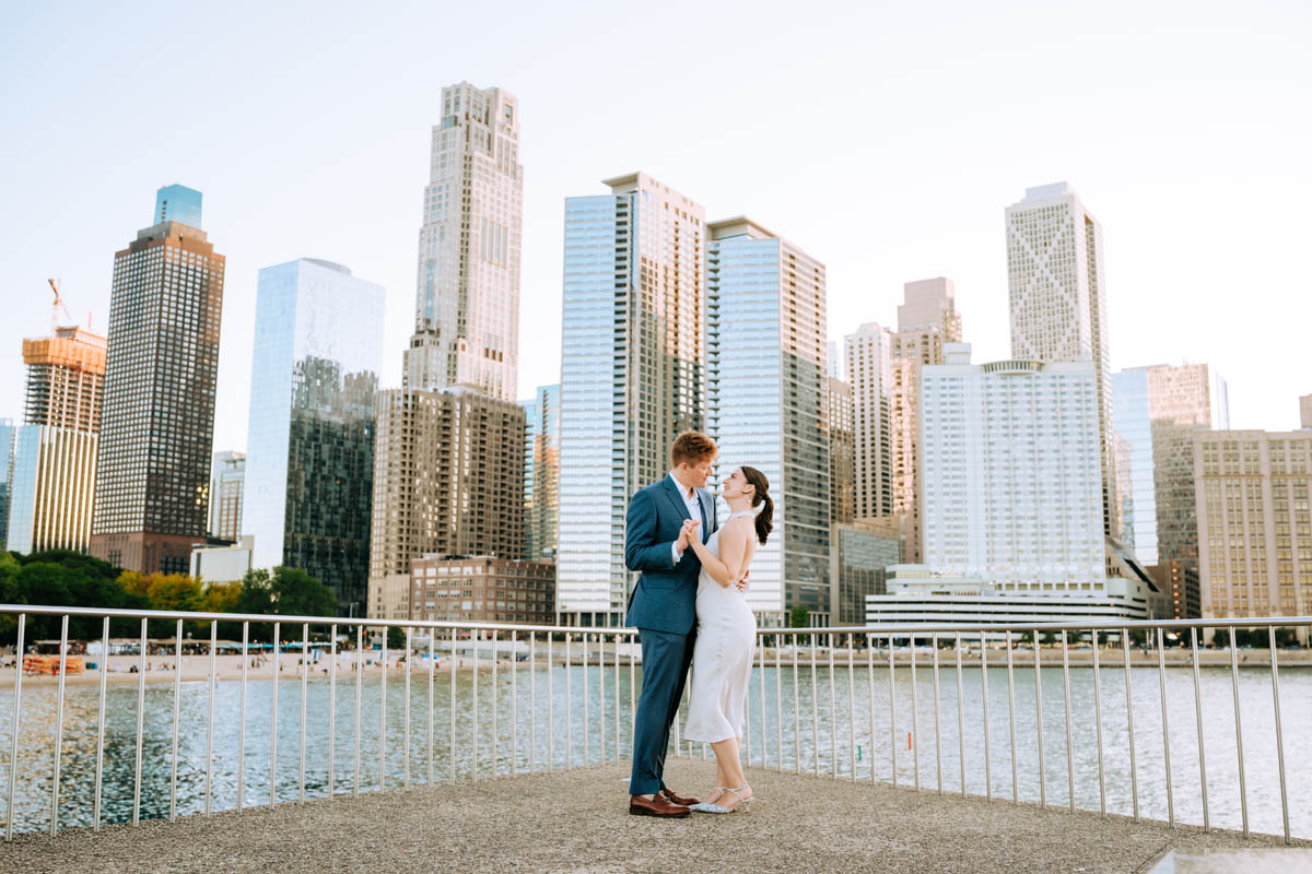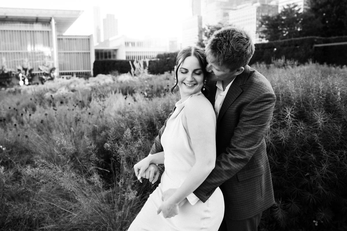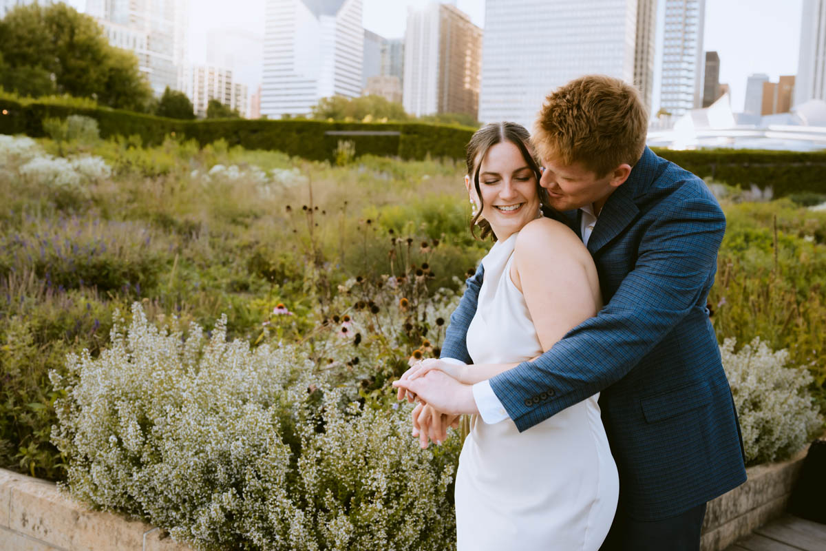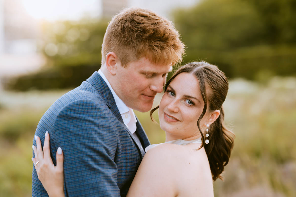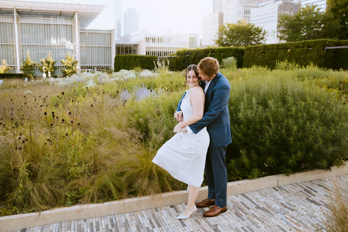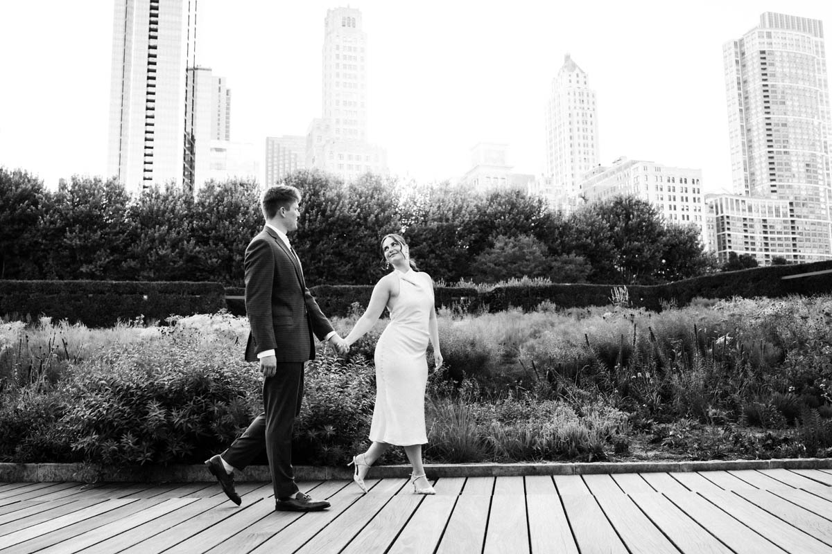 With a rare night off together to enjoy a date night, Grace and Joe had fun laughing and dance together. Stopping at the most iconic spots around the city, they had so much fun together. With the sun gleaming across the L tracks and through the buildings, we started shooting around the Chicago Board of Trade. For a change of scenery, we headed to the beautiful greenery at the Lurie Garden. Then it was off to Olive Park to catch the setting sun while popping the champagne!