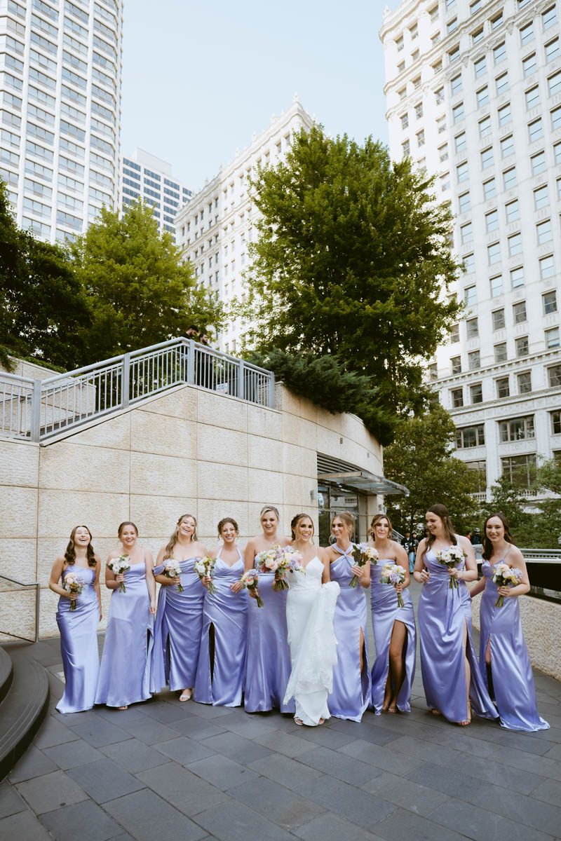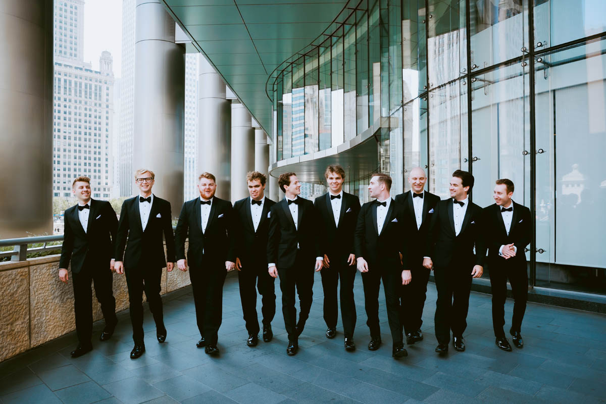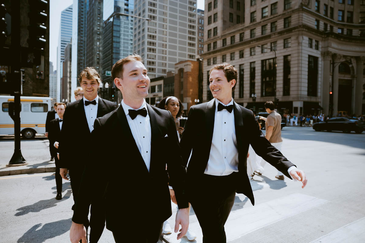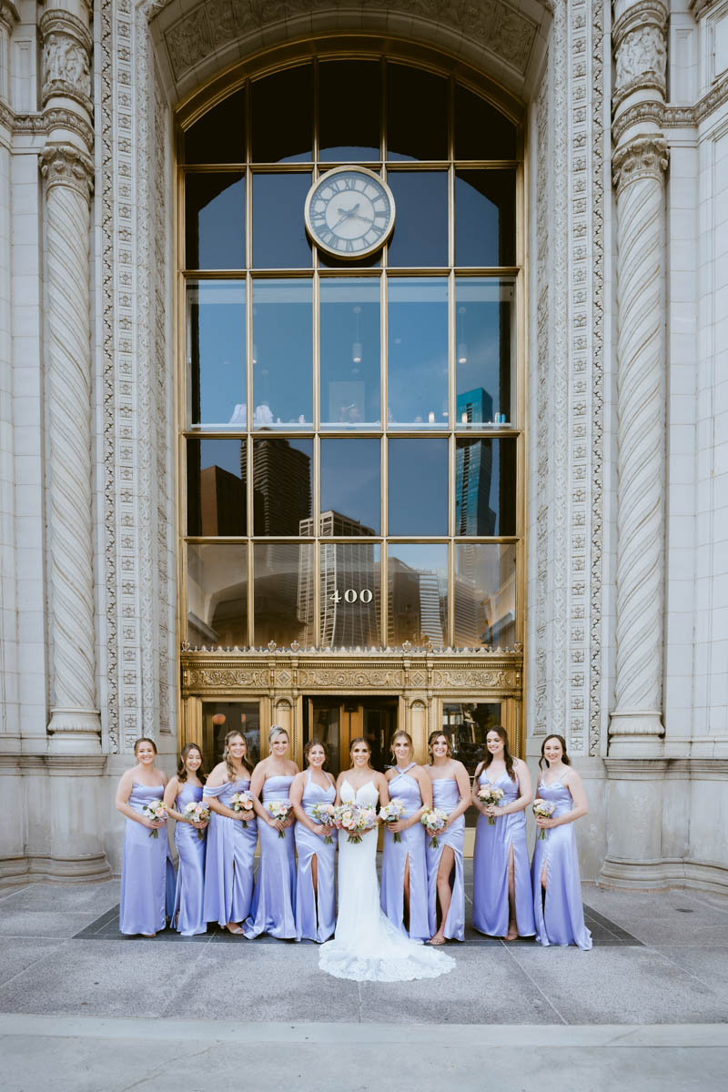 The couple decided to make it a traditional wedding day and not see each other before the ceremony. But the bridesmaids were able to catch a sneak peek as they saw the groomsmen heading to the Wrigley Building for photos.