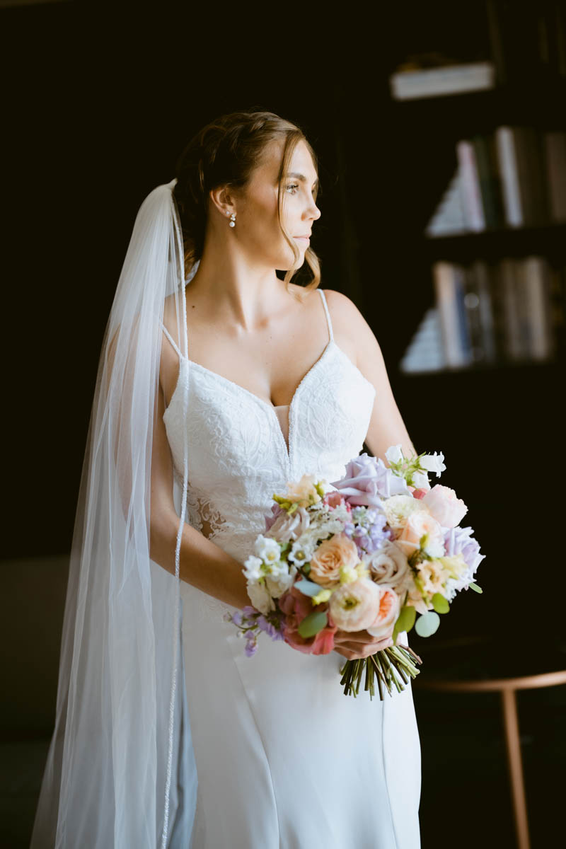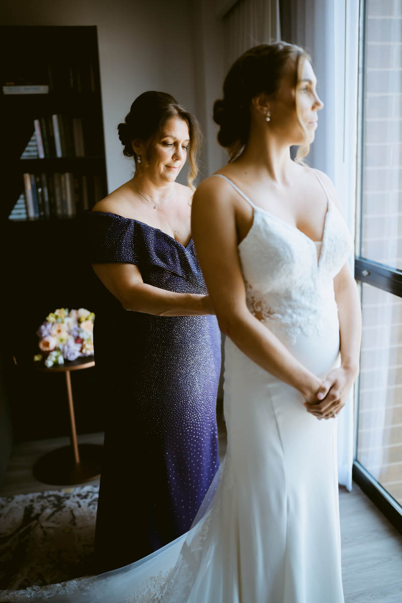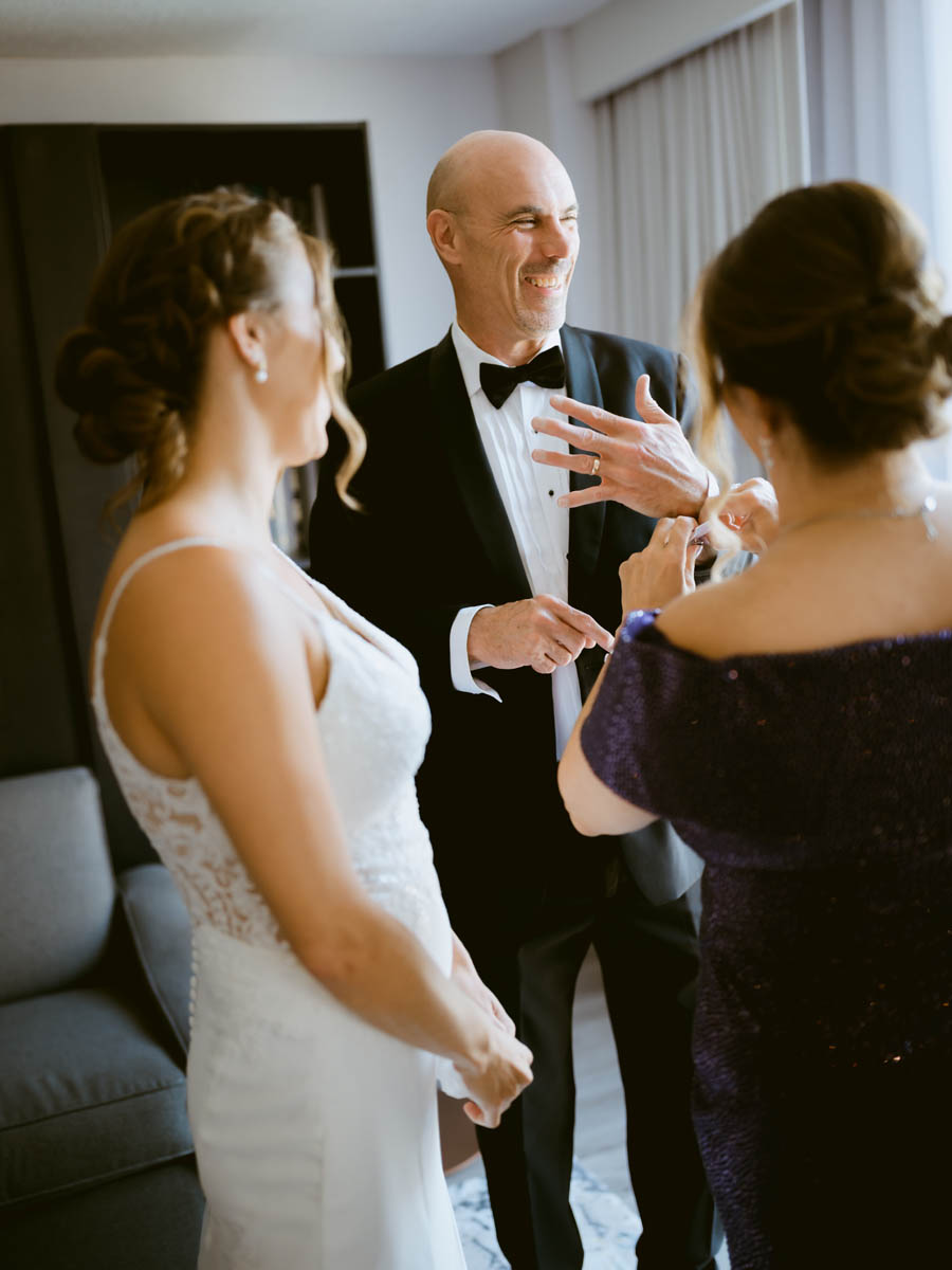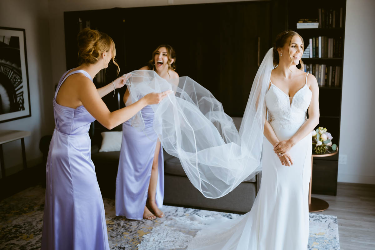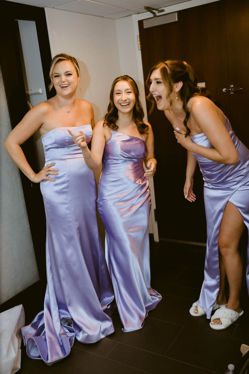 There were plenty of laughs in the bridal suite as the girls were getting glammed up. With toilet paper under her arm pits, Natalie’s maid of honor tried to avoid pit stains on her lavender bridesmaid dress. The bride gave her mom a thought gift of a purse with photos of her as the lining.