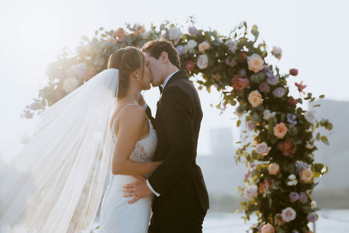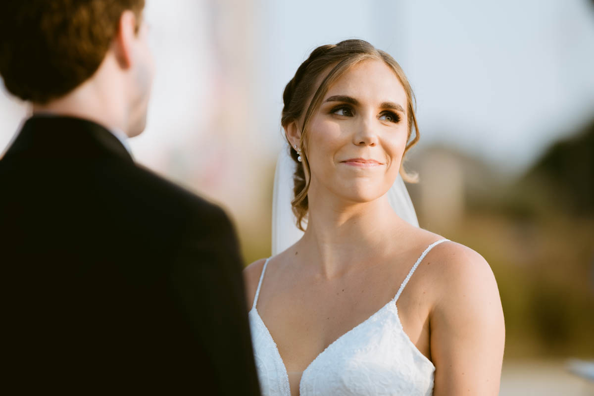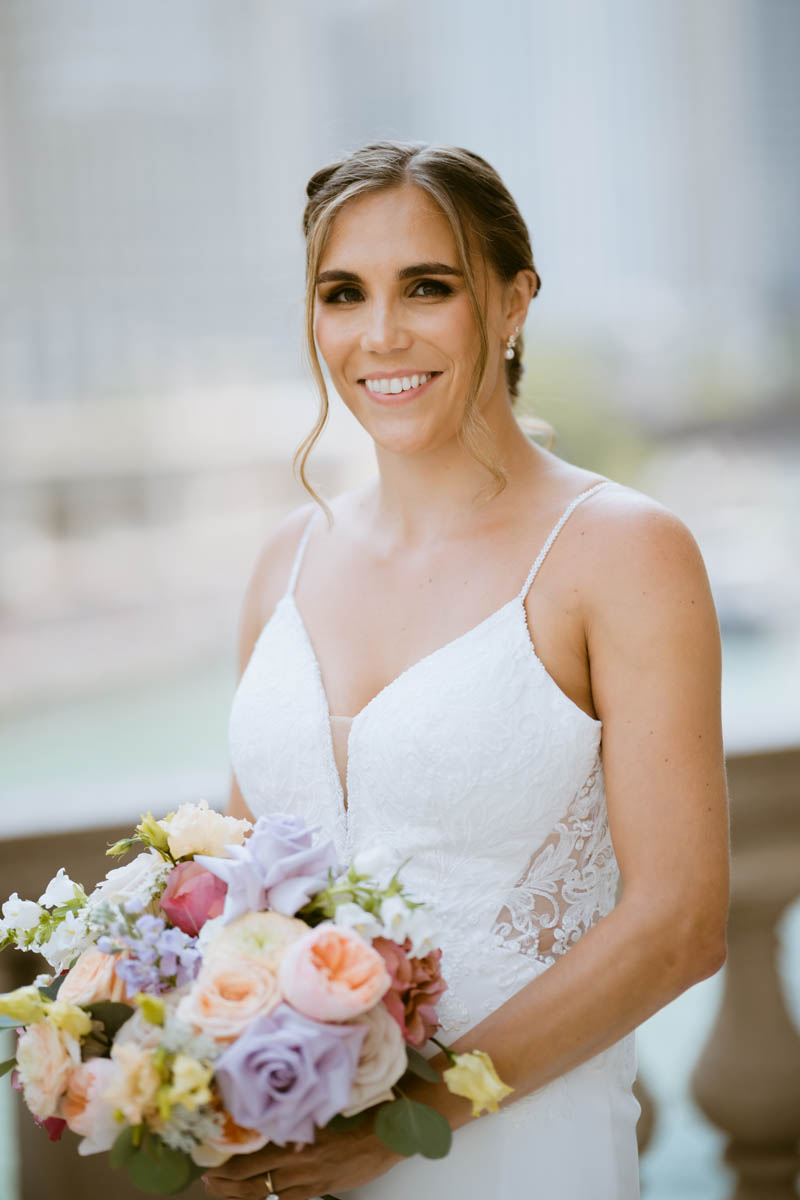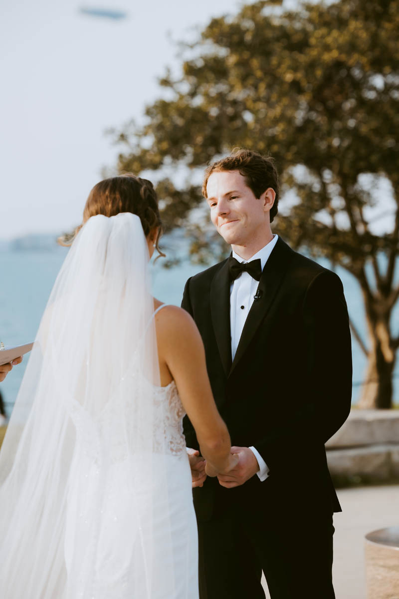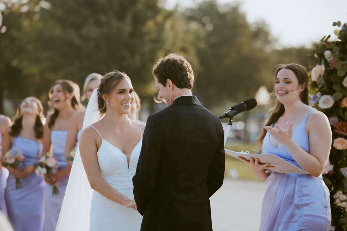 With the bright summer sun shining across Lake Michigan, the guests arrived for the ceremony. Making her big entrance, Natalie walked with her parents down the stairs toward her anxious groom. As the sun began to set behind the city buildings, the couple said their official I do’s. After the ceremony, they wanted a private moment to exchange personal vows they had written to each other.