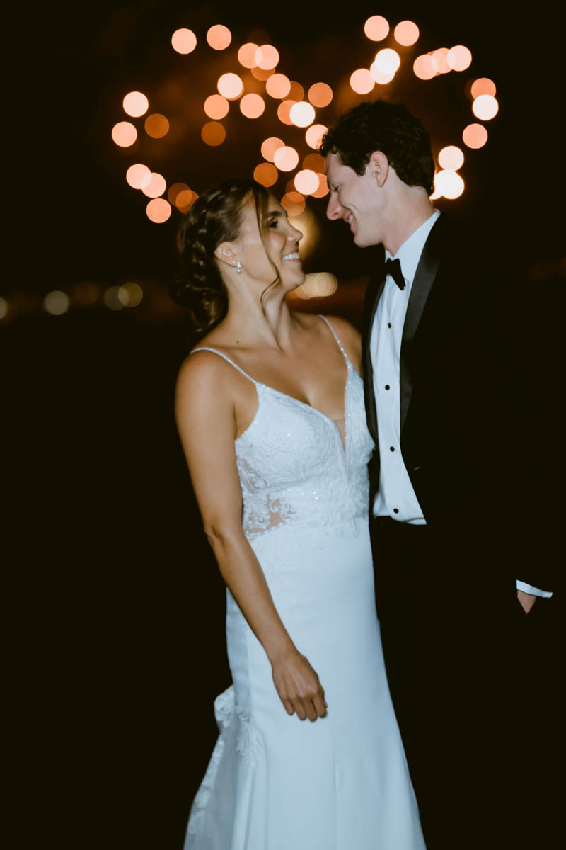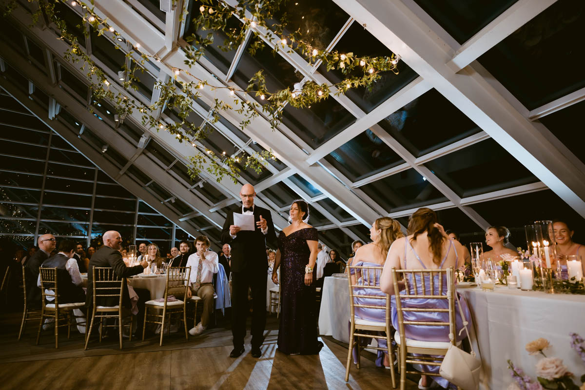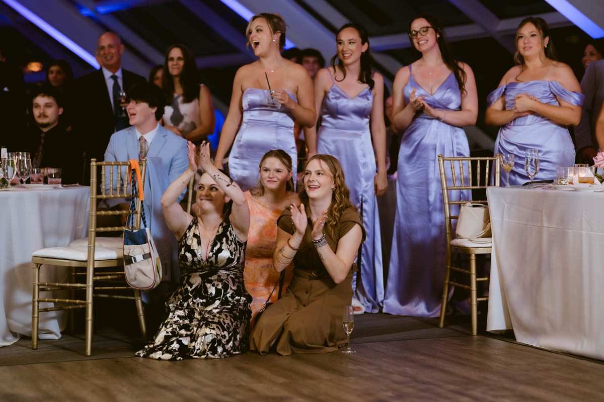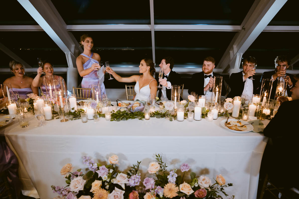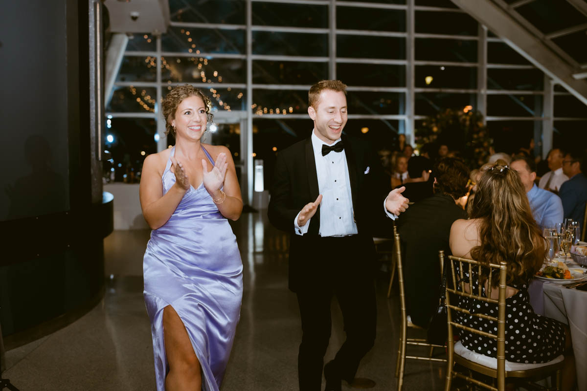Their grand entrance into the reception was met with cheers, whoops and dances. Camping was the theme to their decor and the cake topper. After cutting the cake they were treated to lovely toasts. Before dancing the night away, the guests go to enjoy the firework display from Navy Pier.